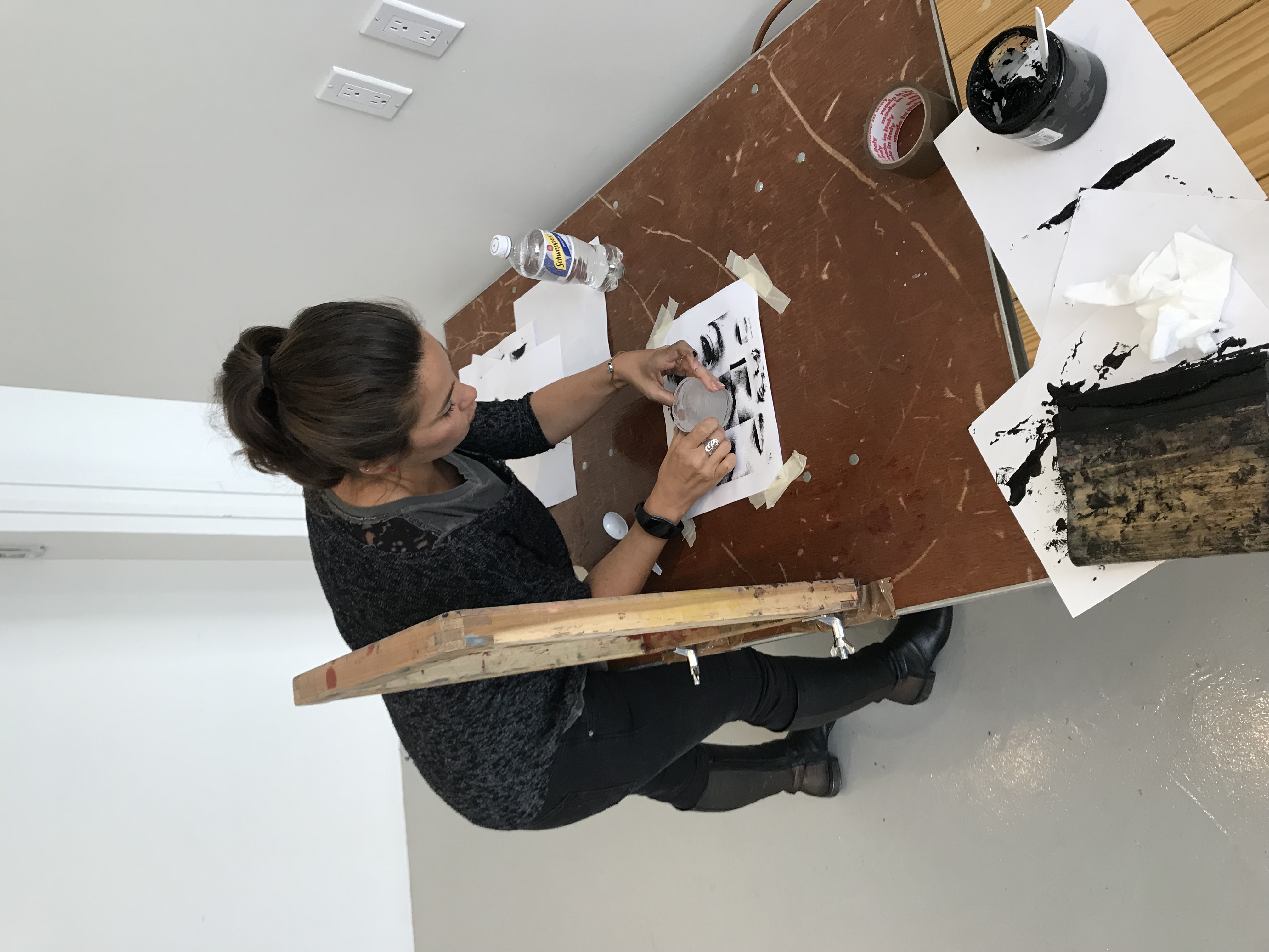 Sziksz’s prints evoked for me the work of the Colombian artist Oscar Muñoz, such as his self-portrait in charcoal dust floating on water, which dissolves as the water drained from the sink. As it turns out, Sziksz is a fan, and for her as for Muñoz, recording the works’ transformation and disintegration is an integral part of its production. In “Edging Forward, New Prints Winter 2018” at IPCNY in New York, she showed both a photograph of the melting artwork and a looped video in which it goes from solid to water to solid again. At the exhibition opening she also presented an unusual “edition” of ten prints: every 15 minutes or so, when the work had dissolved into an inky puddle on its pedestal, she replaced it with another. “The fridge was on the 12th floor of the building but the gallery was on the fifth, so we had to carry each print in a cooler surrounded by ice cubes. It looked as if someone was transporting a donated organ,” she recalls.