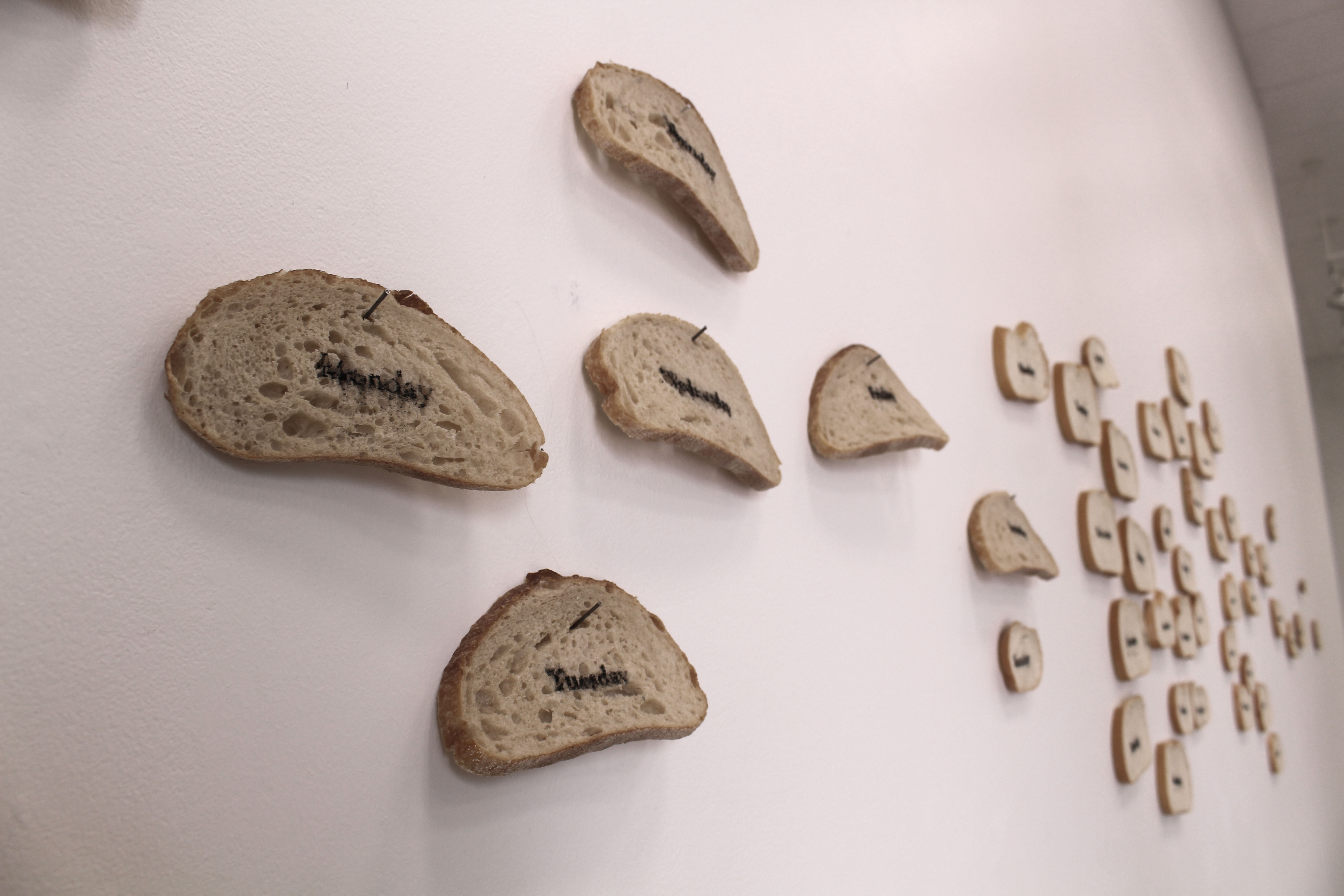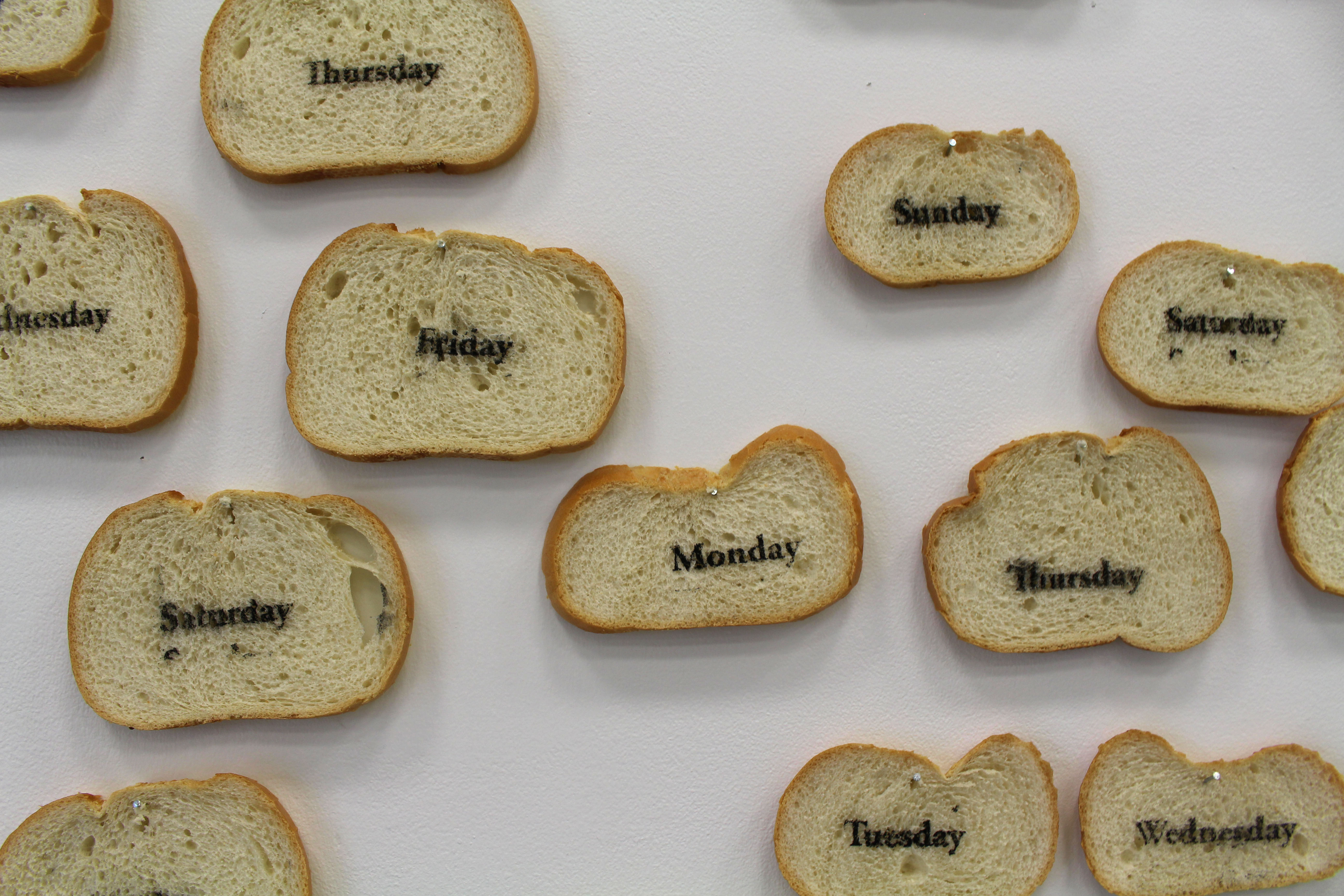 This installation has 28 piece of bread. All individually printed with ash. Ash is a religious symbol have long been associated with sorrow, purification, and rebirth. Each slice of the bread represents a day from my 4 week quarantine.